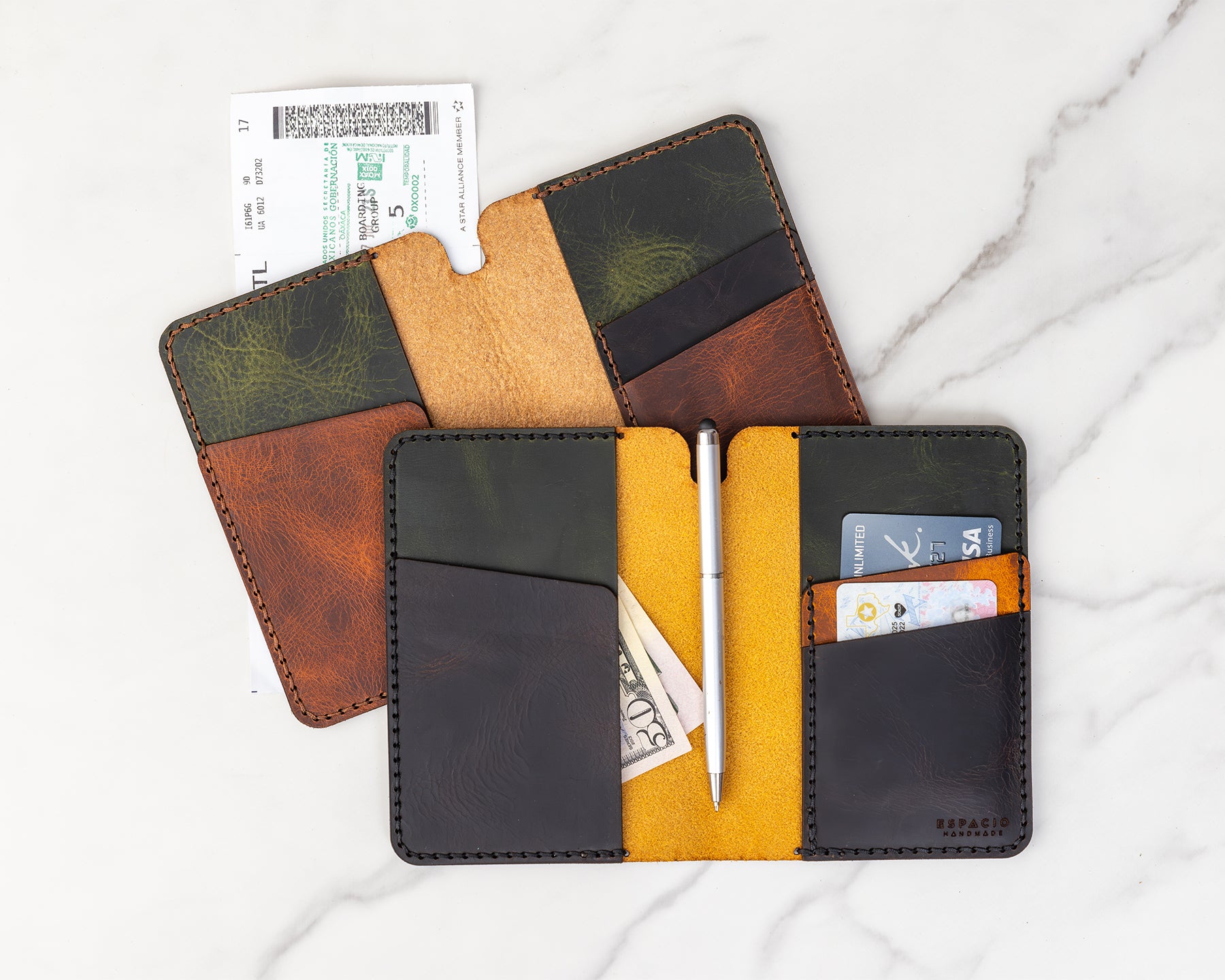 - Two full pockets for passports and cash