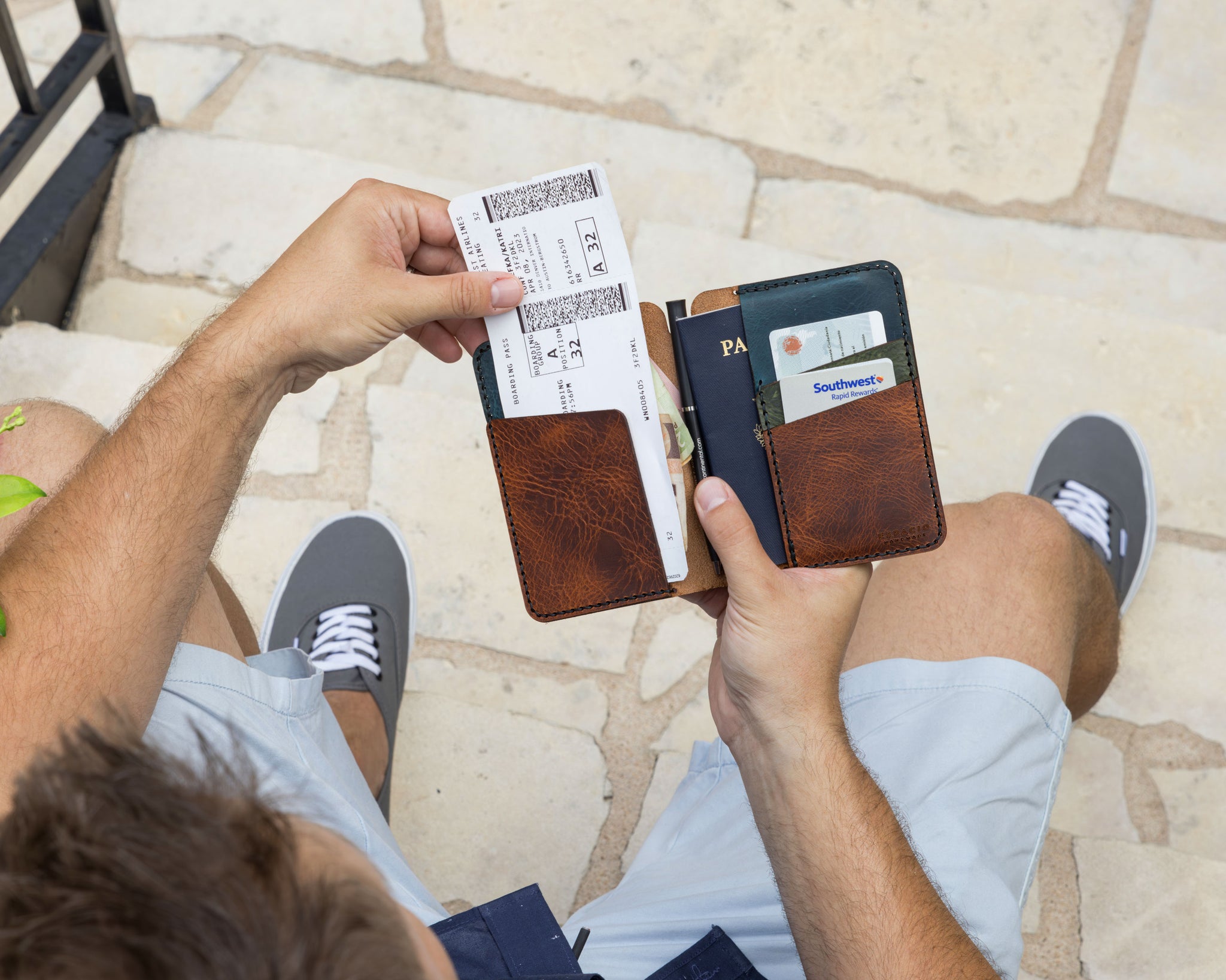 Meet your new travel buddy. The Passport Notebook keeps everything you need tucked into one compact leather cover. Two pockets hold your passports or cash. Two card pockets keep your essentials close. A ticket pocket catches the little papers that try to escape. The pen notch is there because you will always need a pen at exactly the wrong moment.